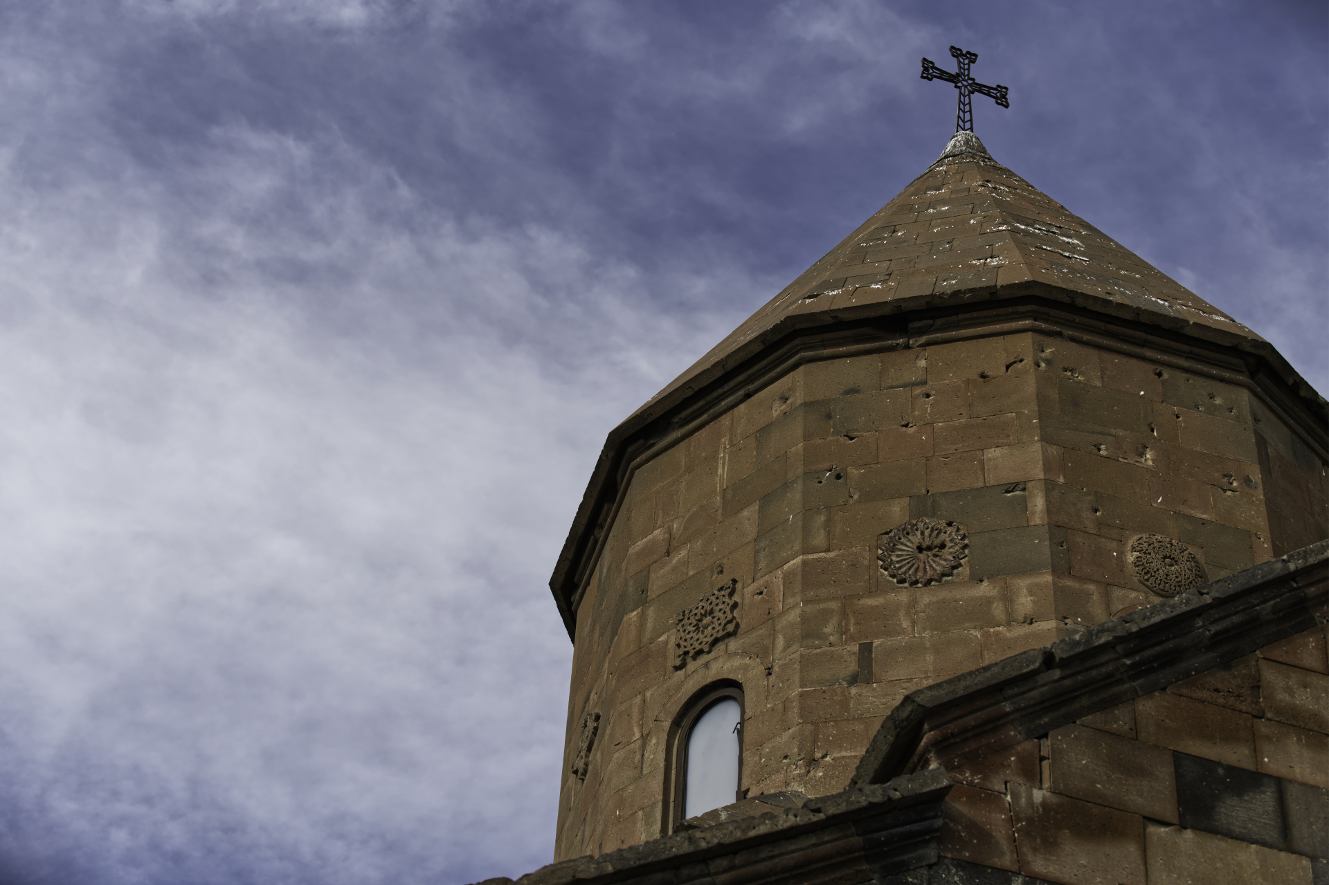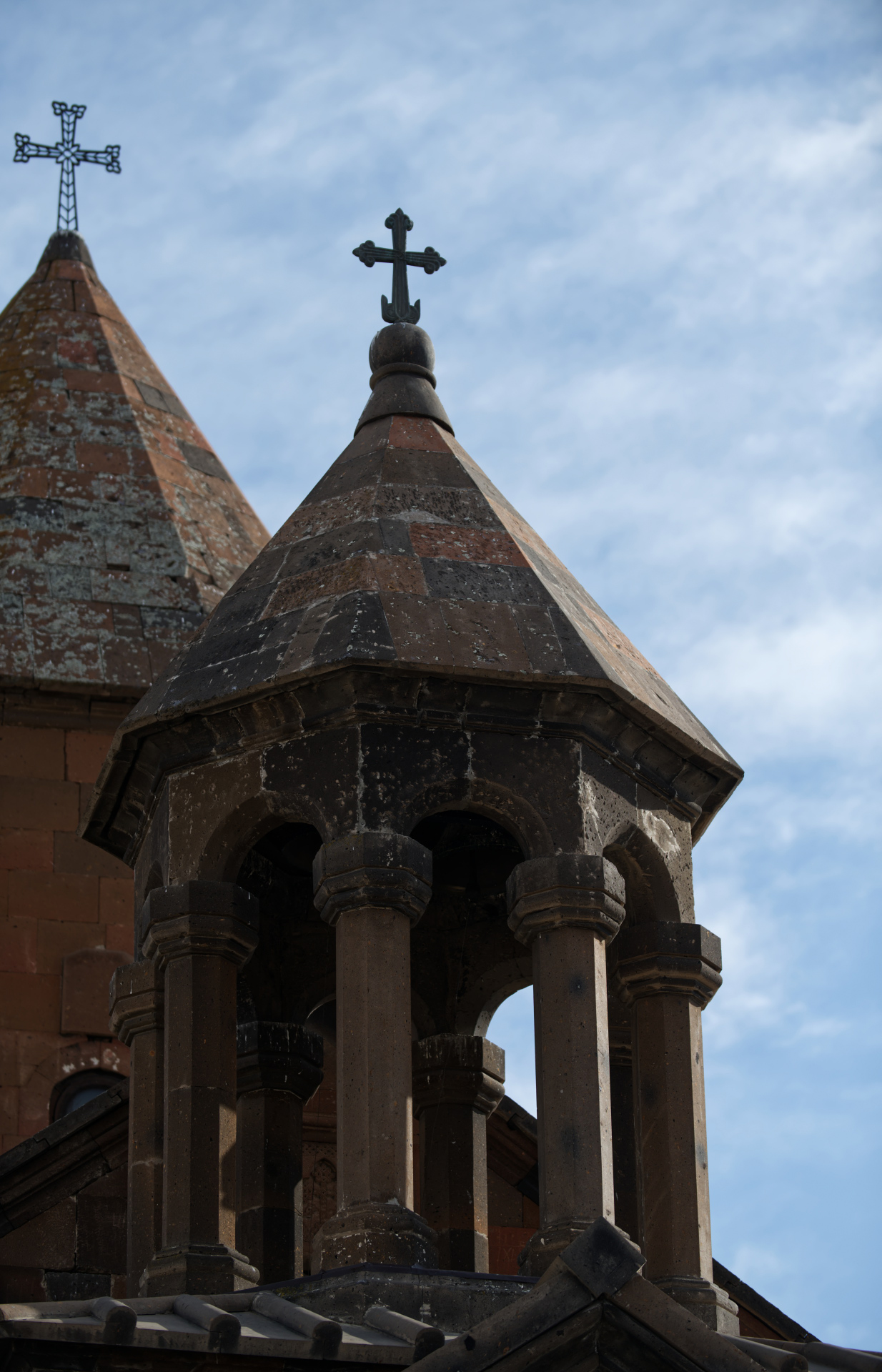 La chiesa principale, Surb Astvatsatsin, svetta con la sua architettura in pietra scura, tipica della tradizione medievale armena.
