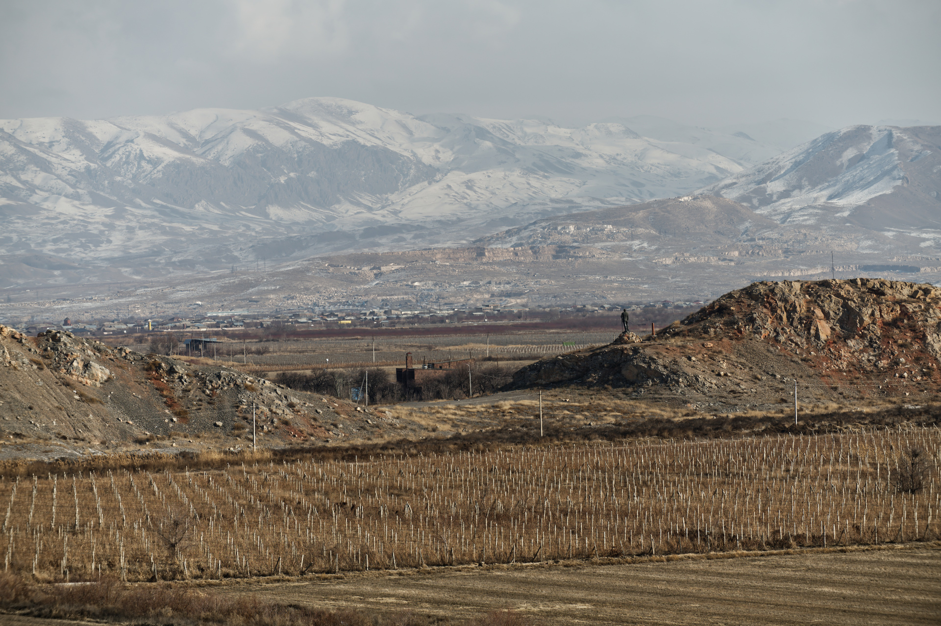 Il paesaggio è dominato dalla maestosa silhouette del Monte Ararat che, pur trovandosi oggi in territorio turco, resta il simbolo identitario e sacro del popolo armeno.